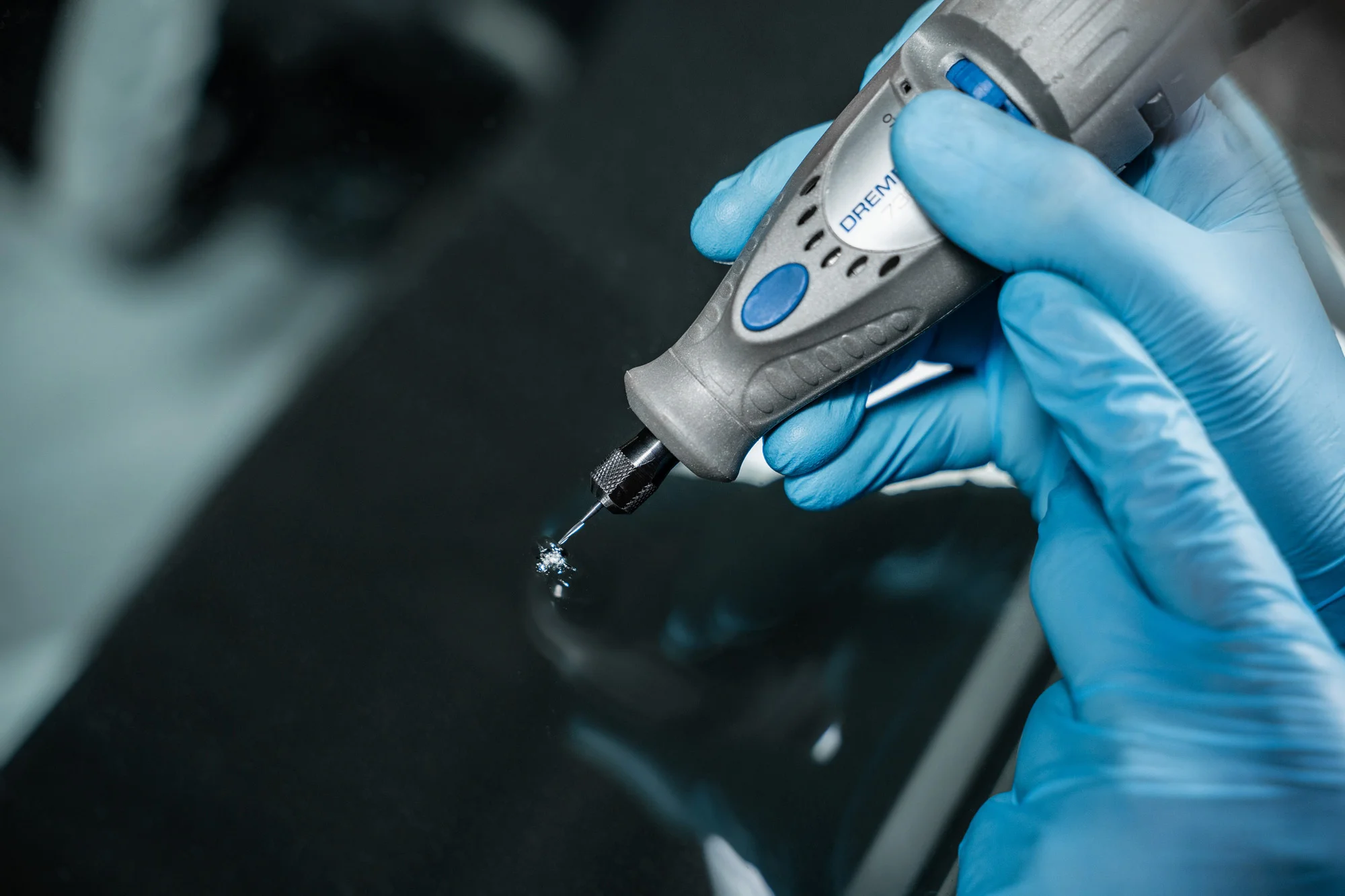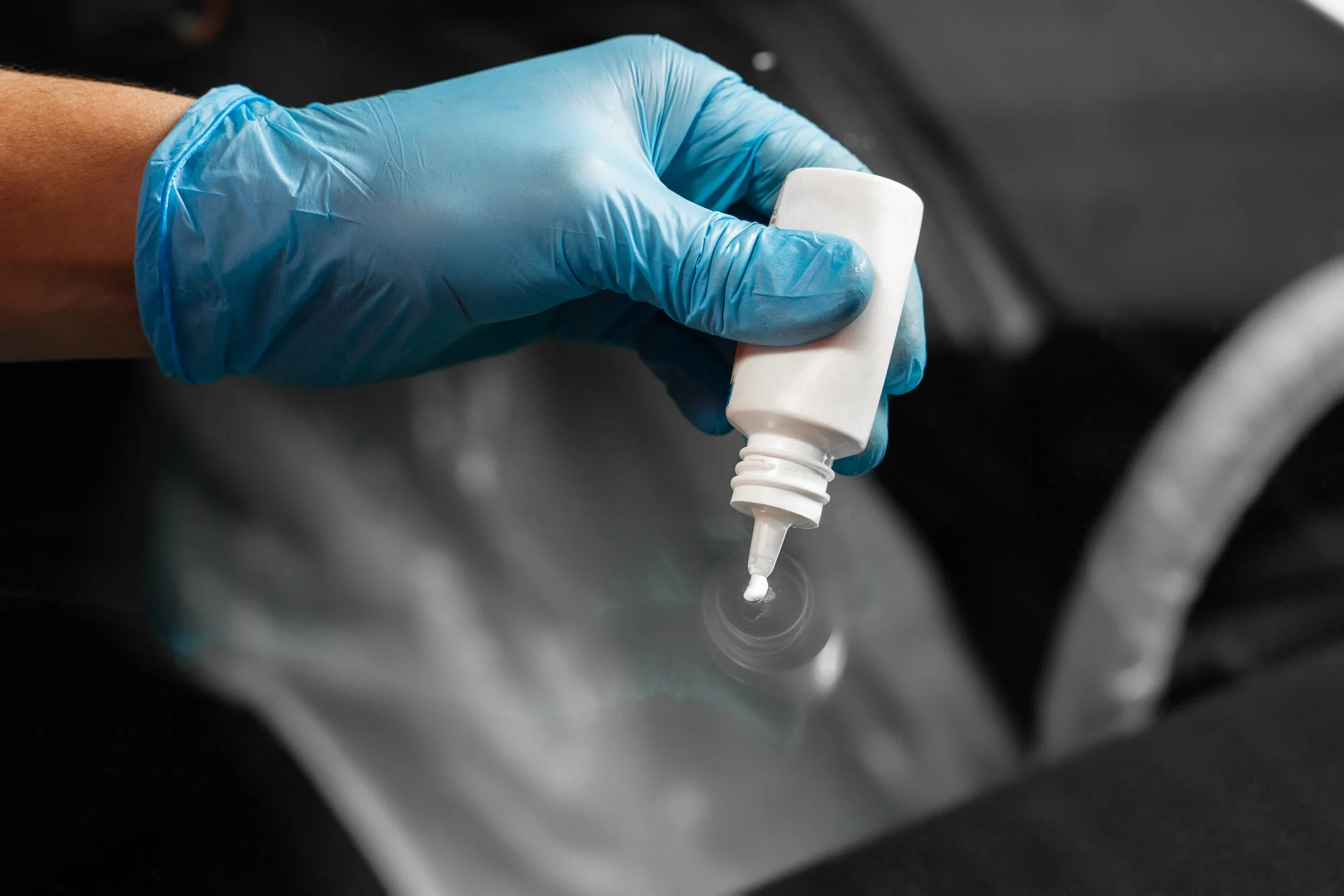 Сначала мастер измеряет температуру стекла: если стекло холодное либо сильно нагрето – скол может дать трещину. Дальше необходимо удалить из полости мелкие осколки. Затем поверхность скола тщательно очищают и сушат
