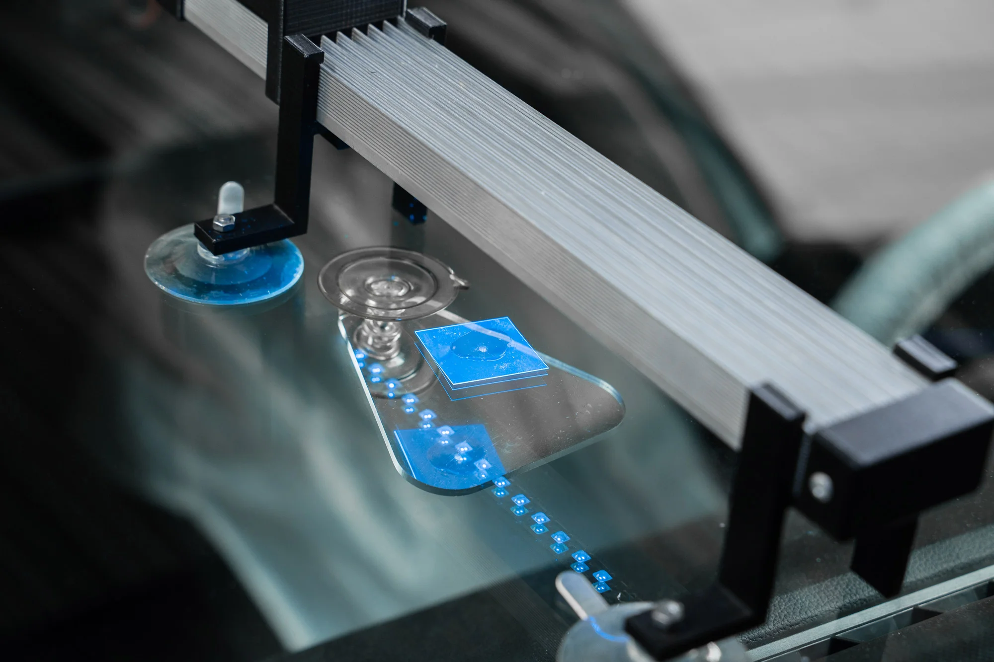 На стекло крепится мост. Если его аккуратно закручивают и выкручивают, чтобы удалить воздух из скола. В мост вставляется инжектор, который давит полимер в скол. Затем поверхность «запечатывается» специальной пластиной.